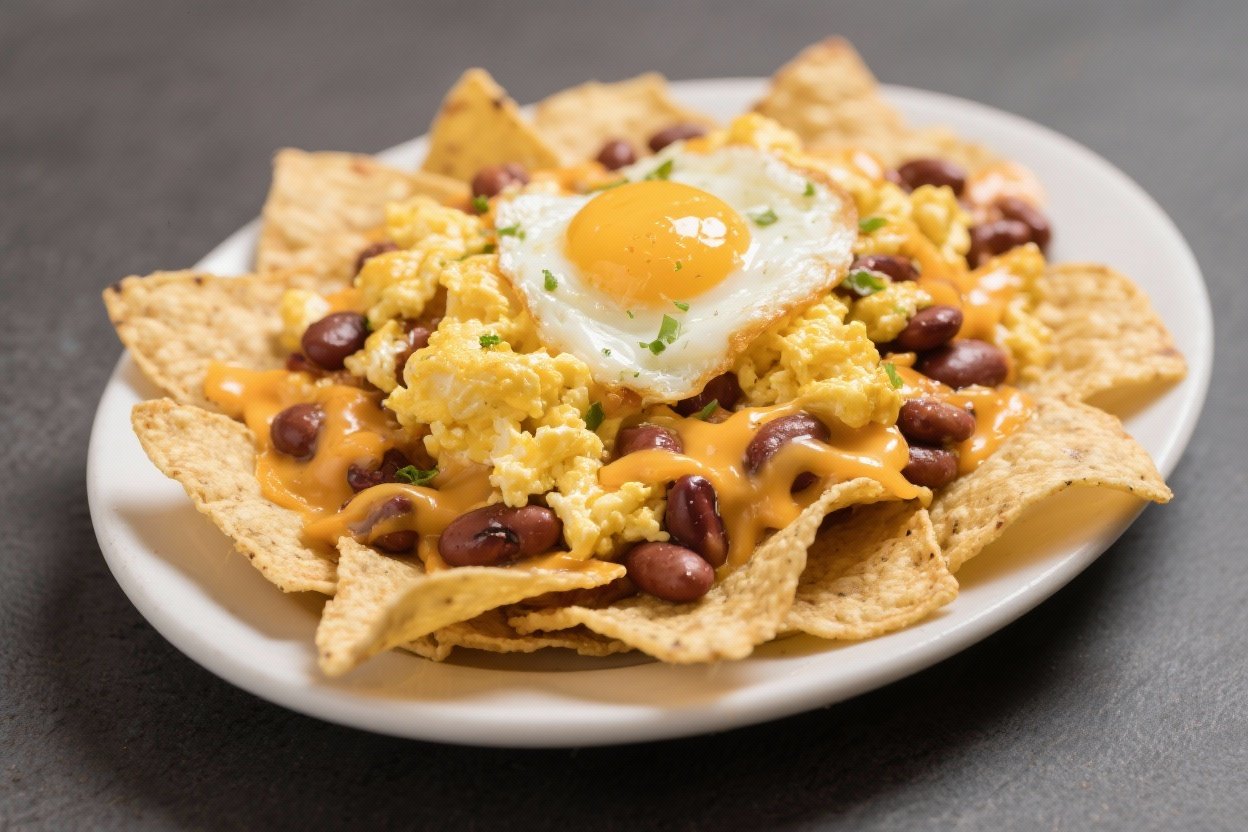 Breakfast Nachos – Scrambled Eggs, Cheese, Beans on Chips