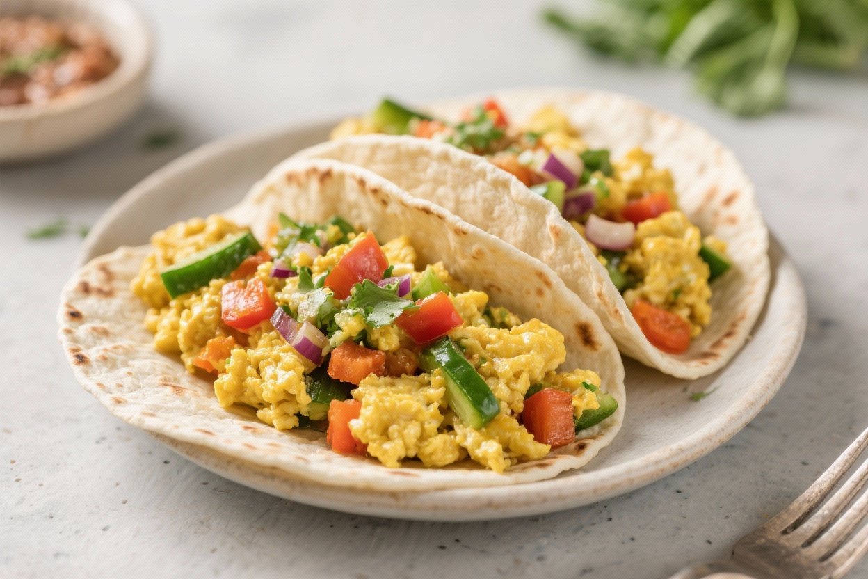 Store the veggie scramble (without tortillas and fresh toppings) in an airtight container in the fridge for up to 3 days. Reheat gently in a skillet over low heat with a splash of water or a touch of oil to keep it soft. Warm tortillas fresh each time for best results.