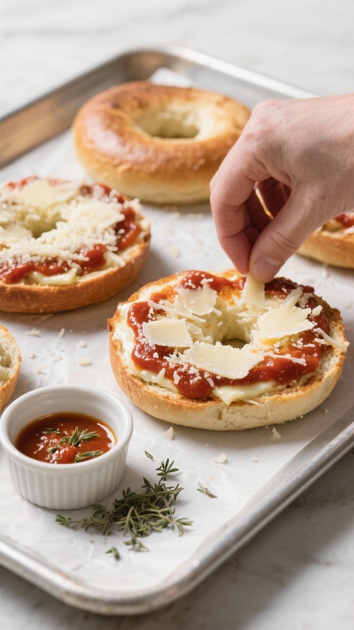 The trick is to toast the bagels first so they don’t get soggy under the sauce. A thicker marinara hugs the surface instead of soaking in, while a mix of low-moisture mozzarella and a little Parmesan delivers that classic pull and salty snap. Whole-wheat bagels add fiber and flavor, and a quick broil locks in the golden top.