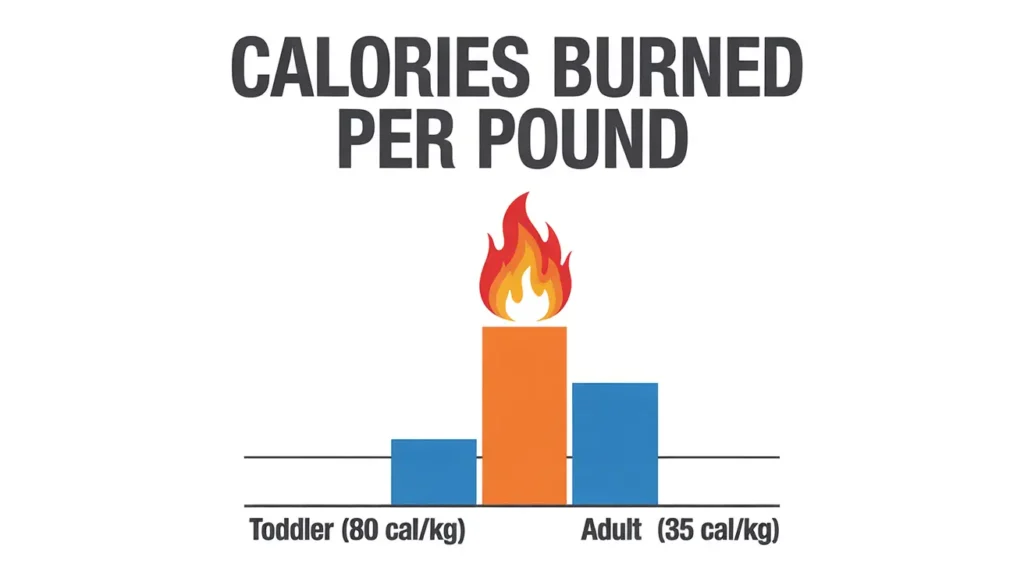 The numbers tell a striking story. Toddlers ages 1-3 require approximately 80 calories per kilogram of body weight daily—compared to just 35-45 calories/kg for adults. NCBI A 25-pound toddler needs roughly 1,125 calories daily, which means they require nearly 2-3 times more calories per pound than their parents.