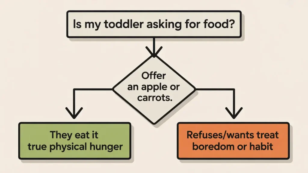 Distinguishing physical hunger from emotional or habitual eating requires attention to specific cues. Jill Castle, MS, RD, pediatric dietitian and author of The Nourished Child, offers a practical test: “If your child is truly, physically hungry, they will eat an apple, carrot sticks, or another nutritious food. If they are bored, or emotional, or just asking out of habit, they may be unhappy with this option, wanting something more enticing.” The Nourished Child