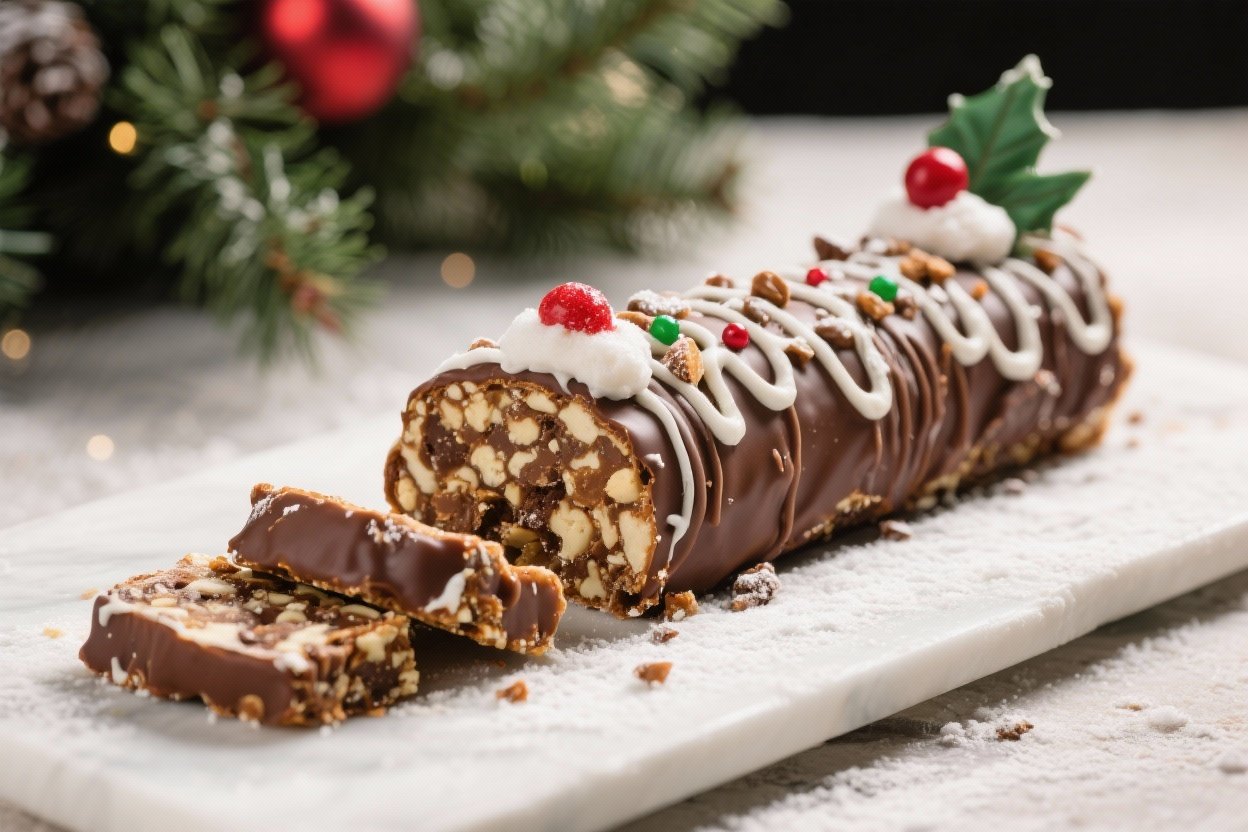 Rolled oats and nuts provide crunch and lasting energy. A dusting of powdered sugar mimics “snow” on the log, and a swirl of white chocolate gives the look of tree rings. The result is festive to the eye and simple to make.